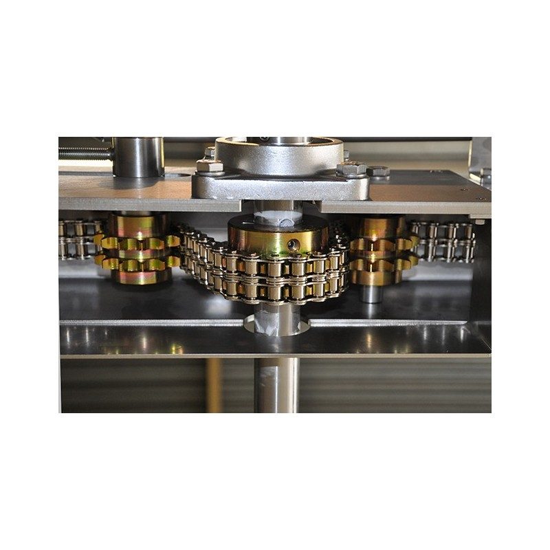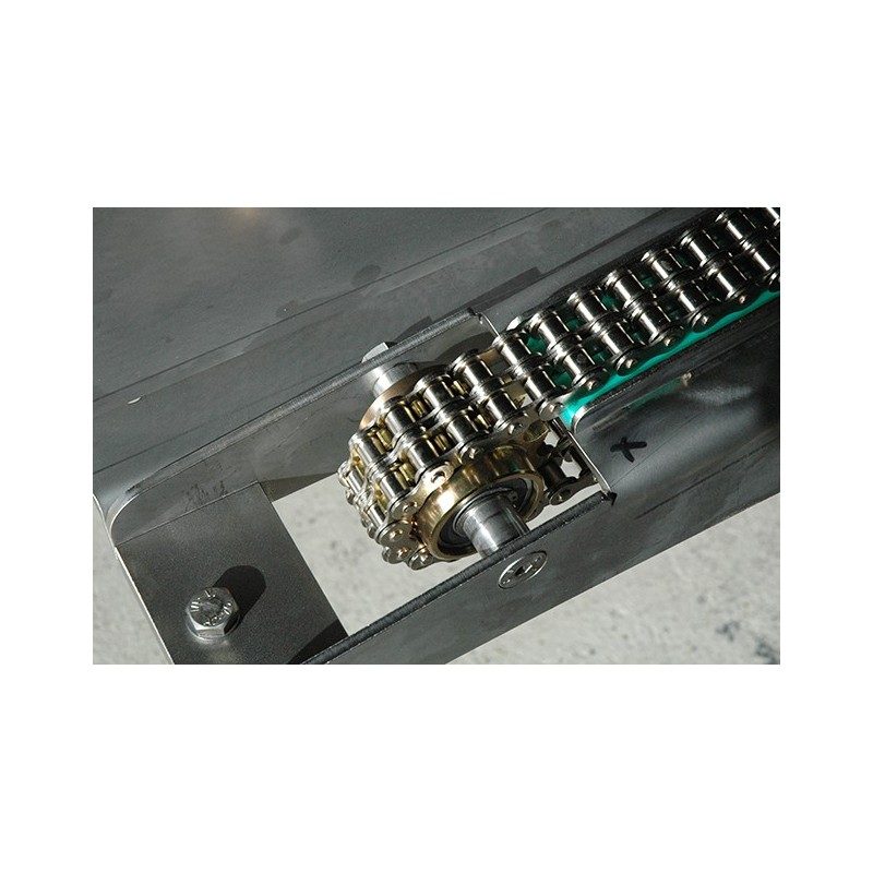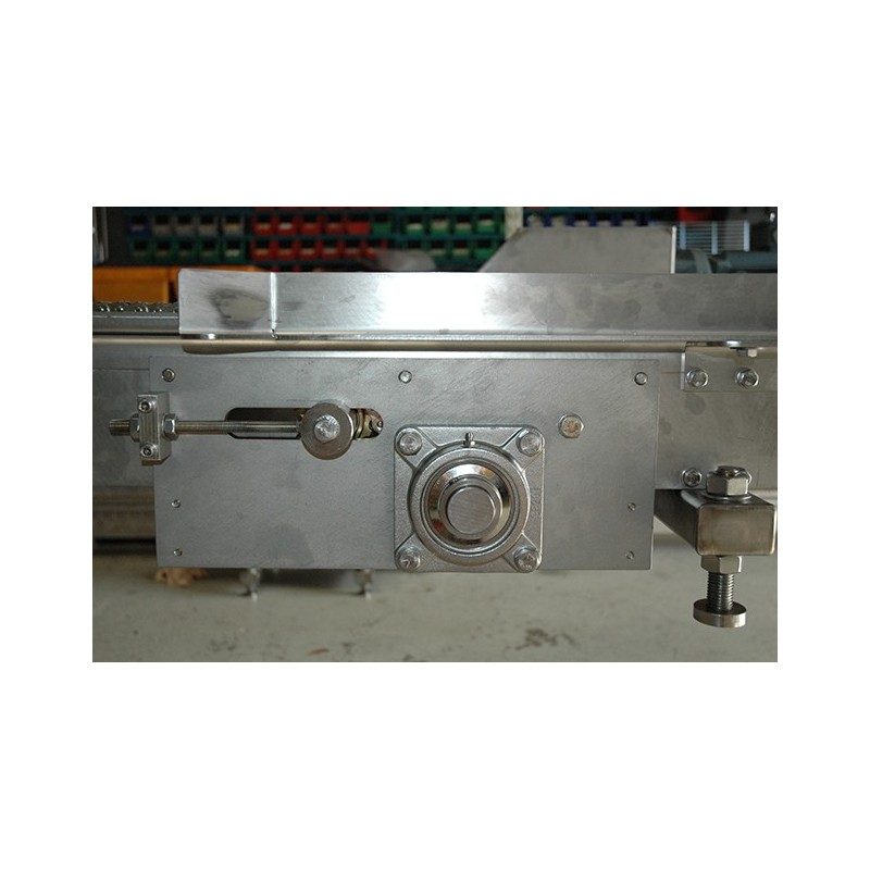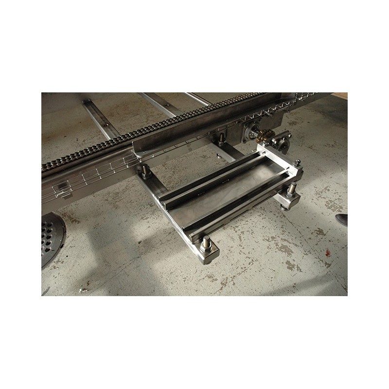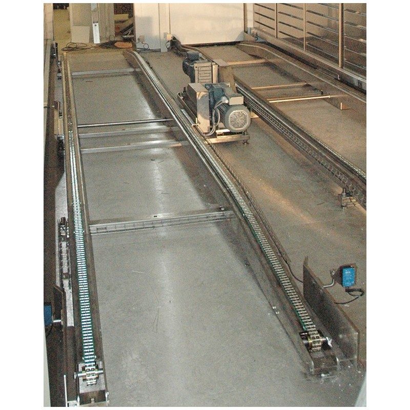 Es können bis zu acht Wagen manuell eingebracht werden und nach Ablauf der Durchlaufzeit zeigt eine Signallampe das Ende des Prozesses an. Der Kettenförderer ist komplett aus Chromstahl gefertigt, mit beheizbaren Lichtschranken ausgerüstet und mit justierbaren Stützen auf dem Isoliatonsboden montiert.