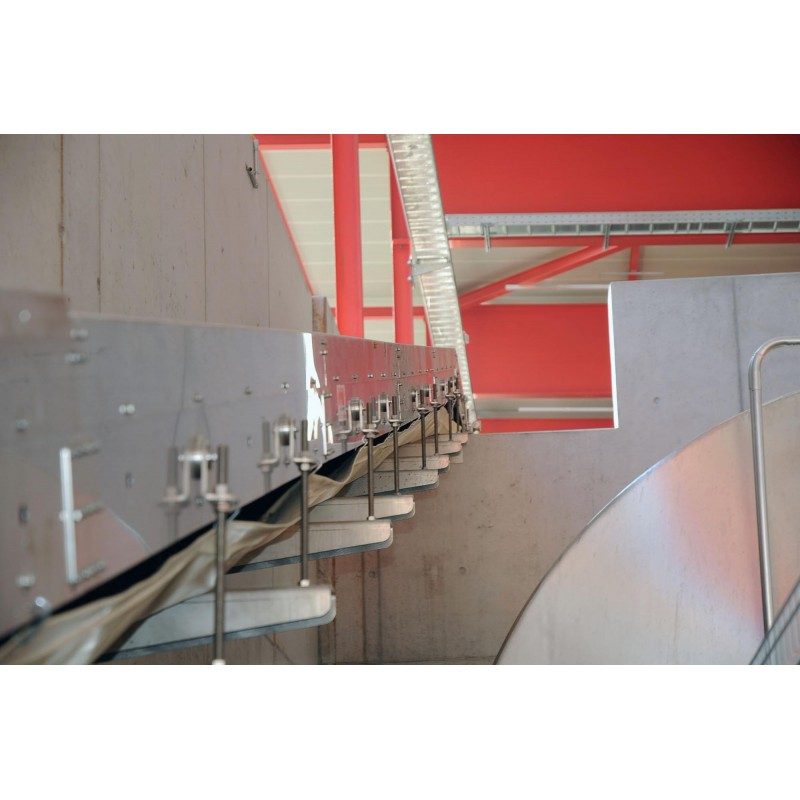 Anforderungen: Das Förderband ist an einer 8 Meter hohen Betonmauer befestigt, so dass darunter weitere Maschinen platziert werden können. Da das Band zweimal im Jahr gründlich mit Wasser gereinigt wird, wurde die gesamte Konstruktion in Chromstahl ausgeführt.