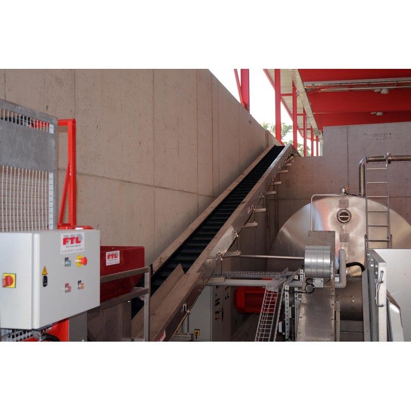 Eine namhafte Recycling Firma im Raum Zürich hat einen neuen Recyclinghof gebaut und braucht für die Aufschüttung ein Steigförderband. Das Recyclinglas wird bei Gastronomiebetrieben mit Kunststoffcontainern (120 bis 240 Liter) eingesammelt und mit einer Kippvorrichtung über einen Trichter dem Steigförderband zugeführt. Dieses transportiert das Glas auf eine Abwurfhöhe von sechs Metern und es entsteht ein grosser Glaskegel für die Weiterverarbeitung.
