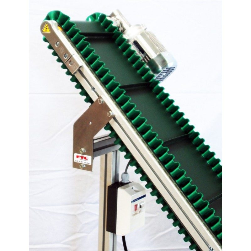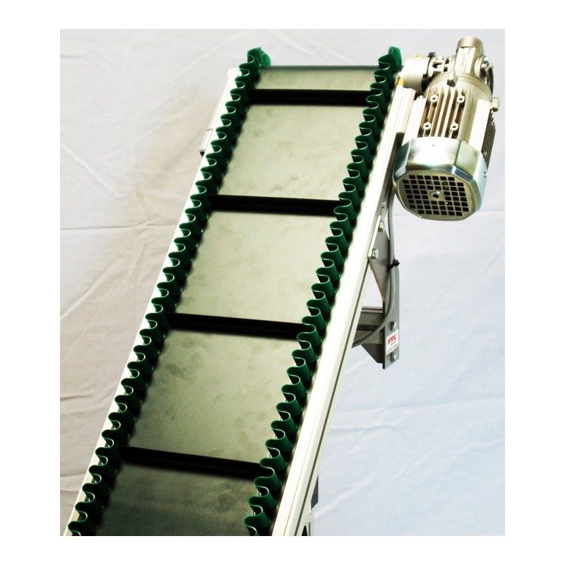 Fördergurttyp: Dunkelgrün mit hellgrünen 30mm hohen Wellenkanten und mit dunkelgrünem 20mm hohen Mitnehmern im Abstand von 200mm