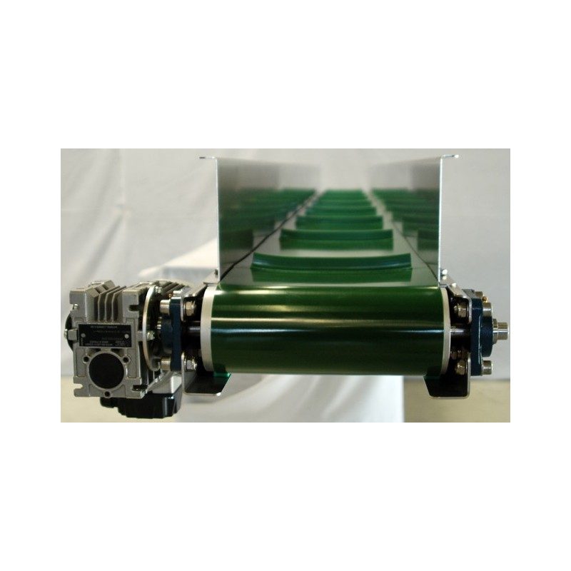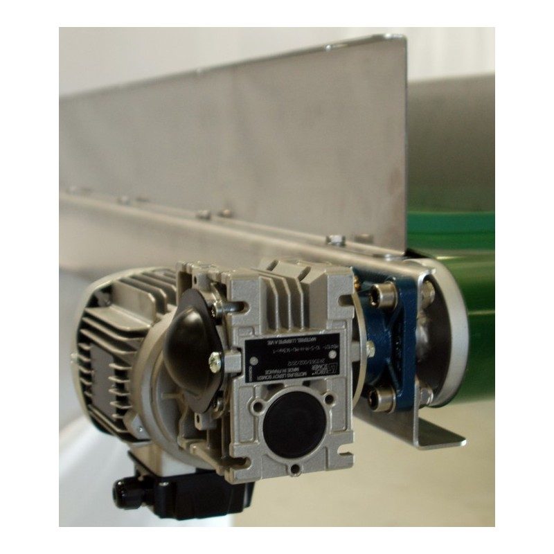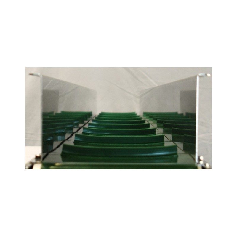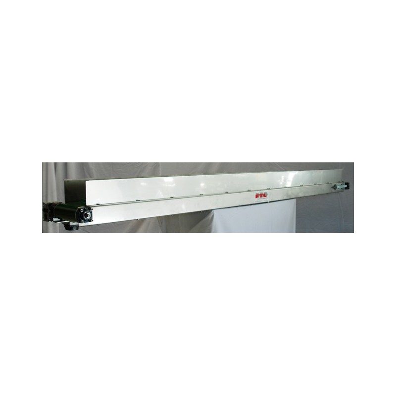 Aufbau Förderband: Robuste Grundkonstruktion aus abgekantetem 3 mm Chromstahlblech und oben seitlich angebrachte Führungswanne, Gurtbreite 250 mm mit Stollen.